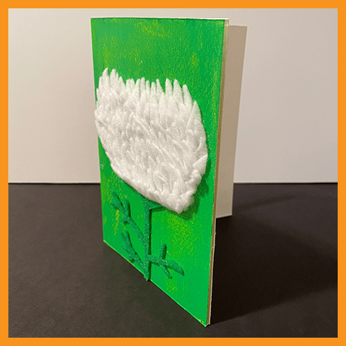 The dimensions are approximately 4.25" x 6". A single envelope is included. The card has been constructed with felt and acrylic on Fabriano Medioevalis Italian paper, and the front design is supported with Plexiglas.